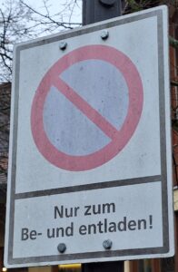 Richtig ist: Der Fahrer stand dort mit dem Dienstwagen nicht während der Veranstaltung, sondern nur kurz nachher, um Frau Dr. Leidig abzuholen. Es gibt dort kein Verkehrszeichen 286, sondern nur das abgebildete Schild. Der Zusatz „Nur zum Be- und entladen!“ ist weder logisch, noch rechtschreibkorrekt, muss aber bedeuten, dass ein Fahrzeug dort im Gehwegbereich kurz stehen darf, um etwas oder jemanden zu bringen oder zu holen.